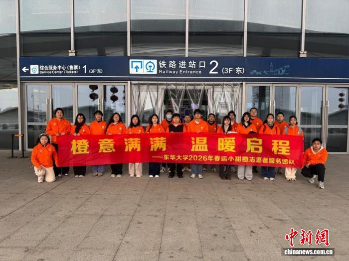 中新网上海2月9日电 (记者 许婧)站内智能导航屏闪烁着实时车次信息,自助售票机前排起长队,拖着行李箱的旅客脚步匆匆……春节脚步日益临近,上海松江站迎来节前返乡客流高峰。在人流交织的车站,一抹亮眼的“橙色”格外醒目——东华大学“小甜橙”志愿服务队身着橙色马甲,带着青春的朝气,用细致入微的行动为万千旅客的平安归途筑牢温暖防线。