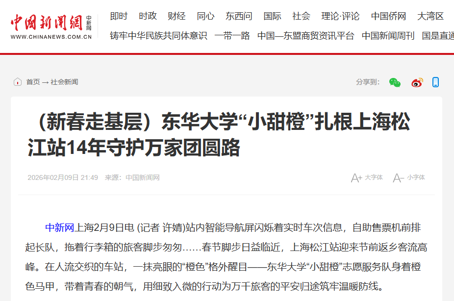 校方表示,未来,东华大学将继续把志愿服务打造成“行走的思政课堂”,引导青年学子在广阔天地间读懂国情、感知民情,积极投身基层治理、乡村振兴、社会服务等时代课题,用实际行动书写“请党放心,强国有我”的青春誓言。(时间:2026年02月09日 来源:中国新闻网 作者:记者 许婧)