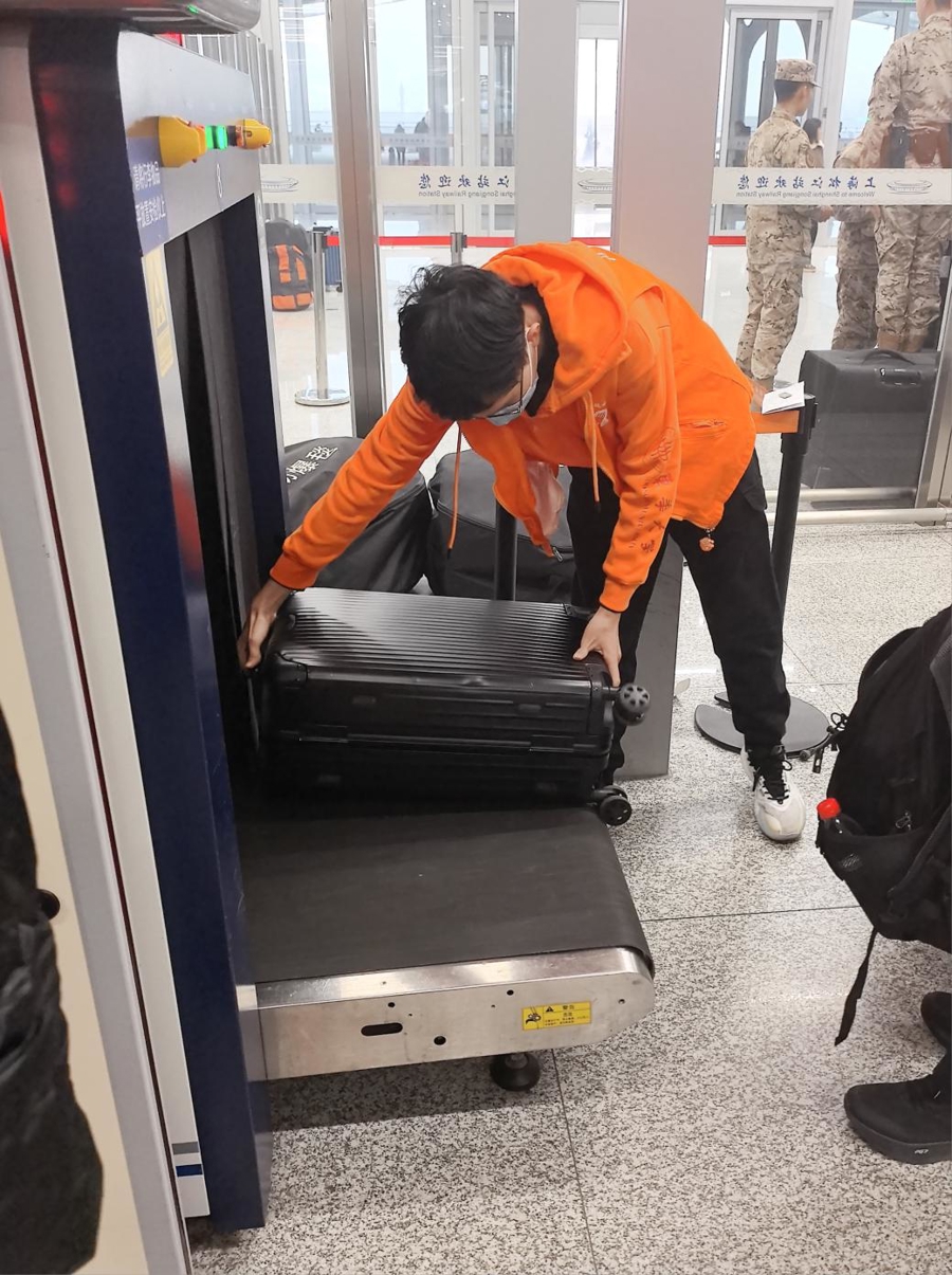 东华大学“小甜橙”帮旅客搬行李。