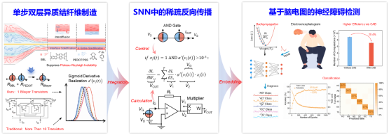 在“制造策略与脑启发计算”层面,团队针对神经形态硬件训练中梯度不可微与高功耗瓶颈,提出“溶剂互扩散固化纺丝(SISS)”策略:通过精准调控溶剂扩散动力学,克服Plateau–Rayleigh不稳定性,制备出具有清晰异质结界面的同轴三层半导体纤维。基于该纤维构建的可调谐织物基垂直有机电化学晶体管(TT-vOECT)能够直接模拟Sigmoid导数特性,从而实现硬件级的替代梯度计算。进一步,团队提出“条件激活反向传播(CAB)”机制,利用双TT-vOECT构建的可重构逻辑阵列,实现了稀疏、事件驱动的权值更新,在脑电信号(EEG)疾病诊断中达到软件级分类精度的同时,减少了约20%的计算冗余,为柔性神经形态硬件平台奠定了基础。(Advanced Materials, 2025: e14904)