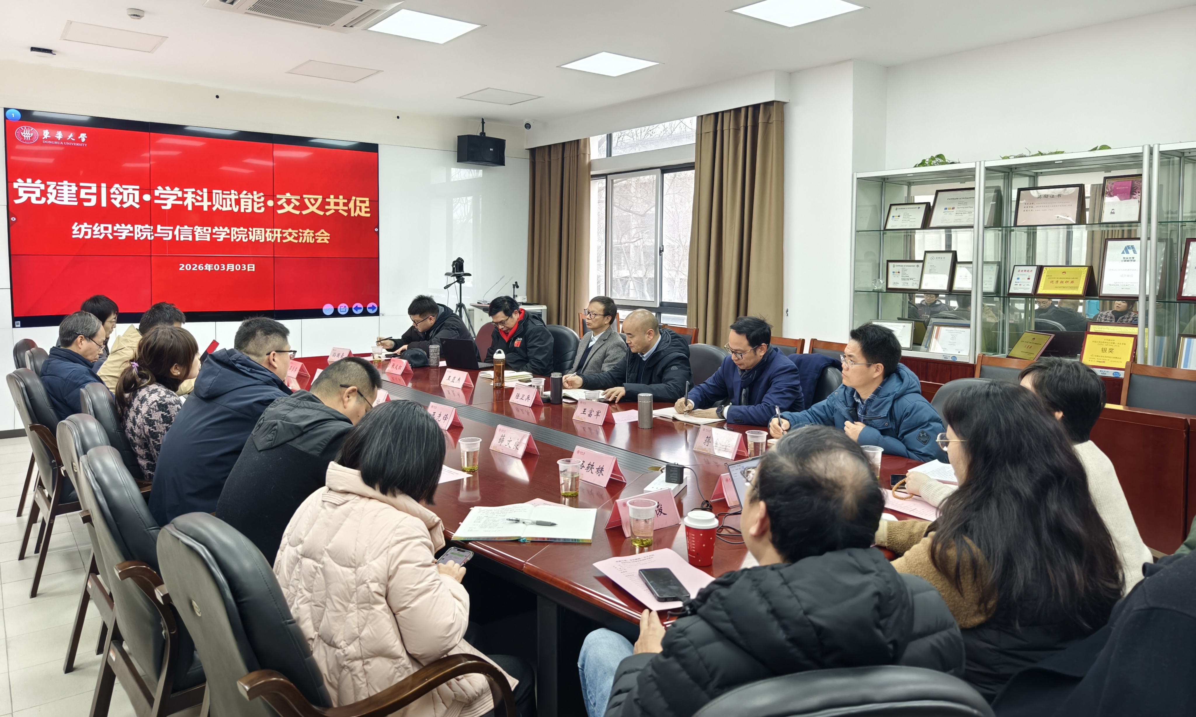 为进一步强化“纺织+智能”学科交叉,3月3日,纺织学院党政班子一行赴信息与智能科学学院(以下简称“信智学院”)调研交流,副校长陆卫兵出席并讲话,双方学院党政班子成员、办公室主任、专职党务干部和相关教授代表参加座谈。会议由信智学院党委书记王直杰主持。