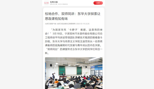 近年来,东华大学马克思主义学院将思政课建设与党的创新理论武装同步推进,着重从新时代伟大变革中凝练教学案例,将思政课堂有效延伸到中国式现代化建设的前沿阵地,连续推出“人民城市”“千万工程”“两山”理念等多堂思政大课,推动思政课实践与专业实践、社会实践有机联动,在知行合一中不断提升思政引领力。(来源:光明日报客户端 作者:光明日报全媒体记者颜维琦 时间:2026-03-20)