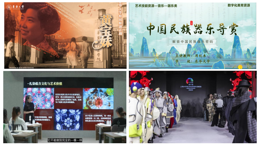 近日,教育部教育技术与资源发展中心(中央电化教育馆)公布2025年度数字化美育资源和智能化美育应用案例征集结果,我校申报的艺术技能资源成果“中国民族器乐导赏——解锁中国民族器乐密码”“布里生花——非遗扎染与时尚创意的碰撞”、艺术活动资源“校园原创话剧《黄宝妹》”“‘汇创青春’——上海大学生文化创意作品展示活动(服装设计类)”入选,将上线国家中小学智慧教育平台美育频道,面向全国师生展示交流。
