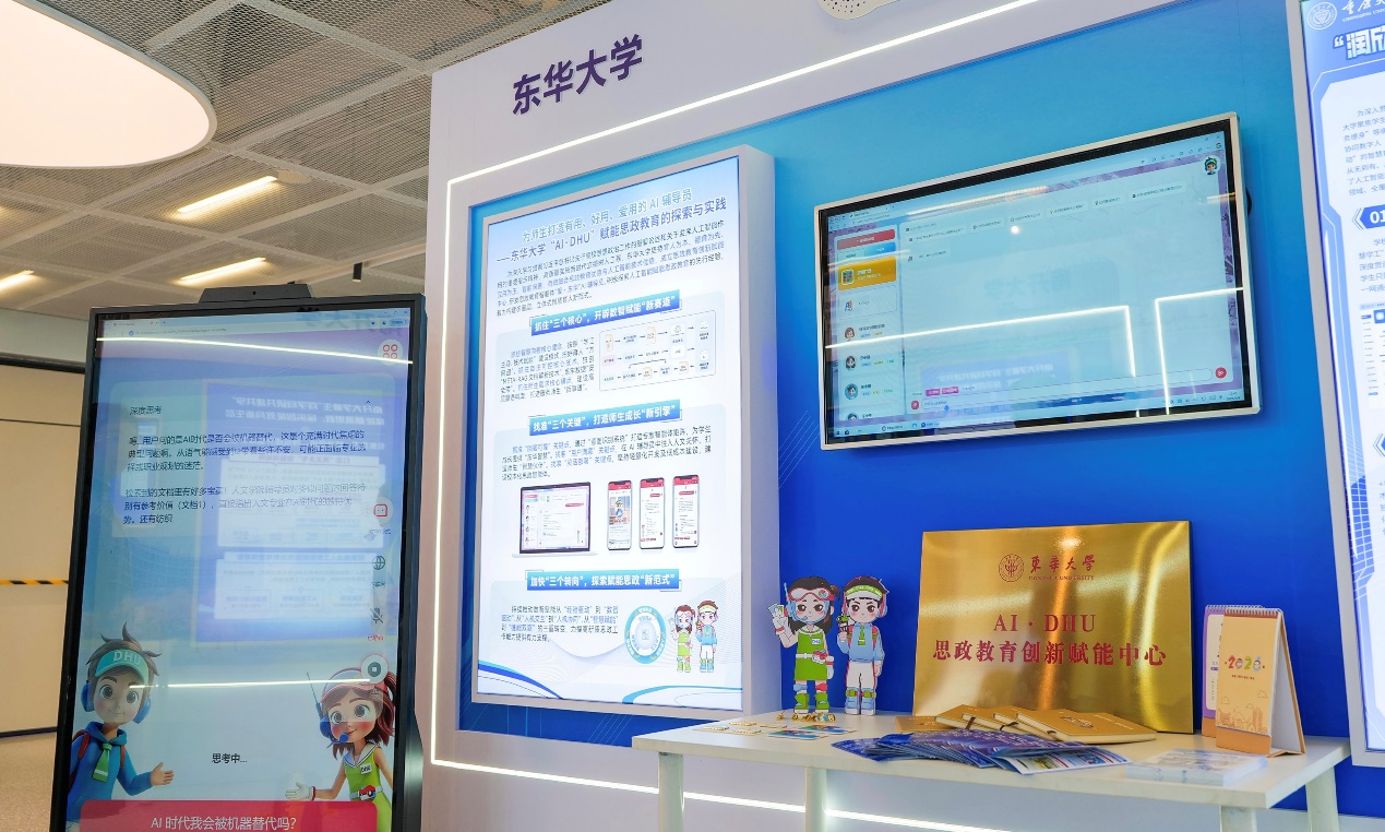 会上举行了人工智能赋能思想政治教育成果发布仪式,我校入选首批人工智能赋能思政工作试点高校、同时入选首批“全国高校思政教育智能体平台”试点单位。活动期间,作为试点高校,我校在现场集中展示了“AI·DHU” AI辅导员、思政交互一体机、“东仔”“华宝”思政数字人等创新成果(全国仅18个受邀布展单位),得到与会嘉宾高度关注和充分肯定。