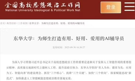 据悉,学校于2025年2月启动“数智赋能思想政治教育专项行动”,以人工智能技术为引擎,聚焦“育人为本、德育为先、应用为王、智能向善”的建设理念,自主研发“AI·DHU”AI辅导员,在沪上高校中率先成立“AI·DHU”思政教育创新赋能中心、开展首届“智能体+”创新设计大赛、发布“东仔”“华宝”思政数字人形象、设立人工智能奖学金、开发智能交互一体机等,着力推动人工智能赋能思政工作由“零散布局”转向“系统构建”,相关特色做法被全国高校思想政治工作网等专题报道。