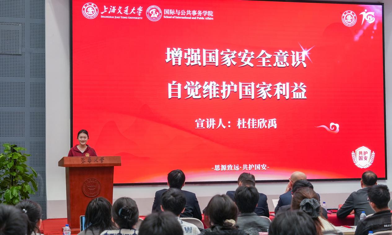 主题宣教阶段,四位宣讲嘉宾紧扣国家安全各领域重点依次作专题宣讲。上海交通大学总体国家安全观学习宣讲团成员杜佳欣禹以“增强国家安全意识 自觉维护国家利益”为题,立足粮食安全、军事安全、生物安全与生态安全等方面,阐释国家安全的战略内涵。中国出口信用保险公司上海分公司项目险业务处客户经理、上海市国家安全人民防线宣讲团、上海金融系统青年讲师团成员李雪涵以“守丝路资产之安,拓命运与共之路”为题,聚焦金融安全与海外利益保护,分享金融助力国家安全的实践与思考。上海市经信委中小企业发展服务中心、徐汇区民族联、侨联青委会理事韦佳欣以“早安,午安,晚安——来自中小企业的24h守护”为题,围绕产业安全与中小企业发展,讲述护航发展、守护安全的生动实践。我校机械工程学院2022级本科生刘佳楠以“一秒钟,守牢国家安全的三道防线”为题,结合青年学生视角,倡导自觉筑牢安全防线、主动维护国家安全。