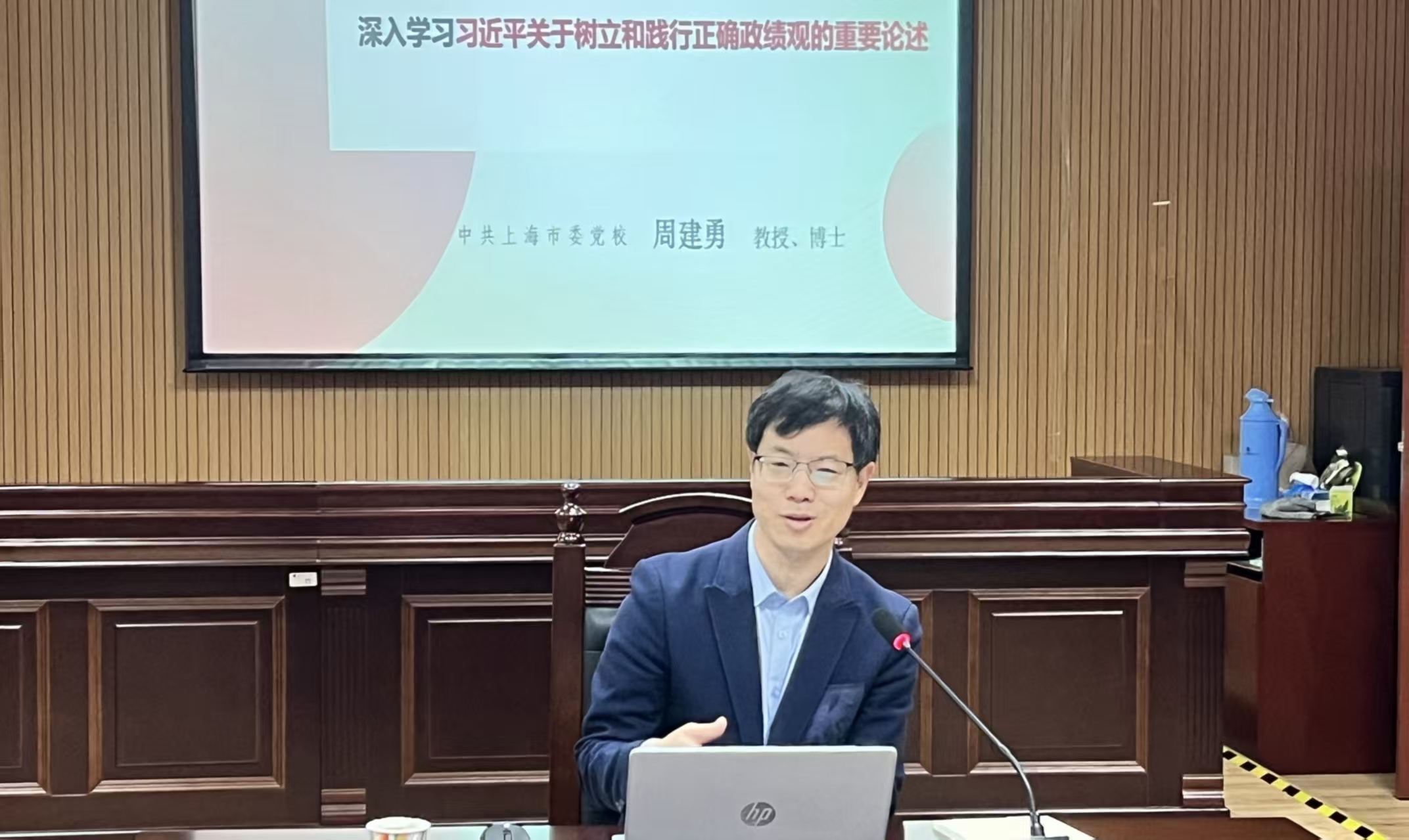 为推动党员干部深刻把握正确政绩观内涵要求,4月16日,人文学院党委邀请上海市委党校周建勇教授作专题辅导报告,学院领导班子、全体党支部书记及师生党员代表参加学习。人文学院党委书记韩哲宇主持。