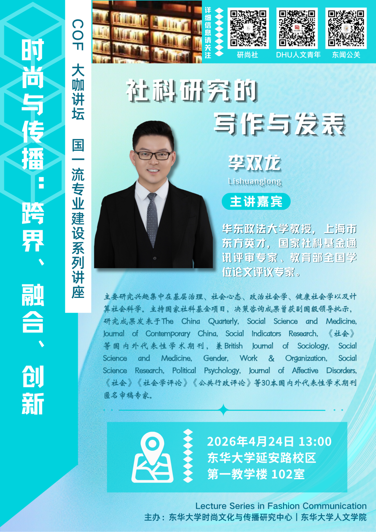 主讲人简介:华东政法大学教授,上海市东方英才,国家社科基金通讯评审专家、教育部全国学位论文评议专家。主要研究兴趣集中在政治社会学、健康社会学以及计算社会科学。主持国家社科基金项目,决策咨询成果获重要批示,代表作发表于The China Quarterly, Social Science and Medicine, Journal of Contemporary China,《社会》等国内外代表性学术期刊。兼British Journal of Sociology, Social Science and Medicine, Gender, Work & Organization, Social Science Research, Political Psychology,《社会》《社会学评论》《公共行政评论》等30余本国内外代表性学术期刊匿名审稿专家。